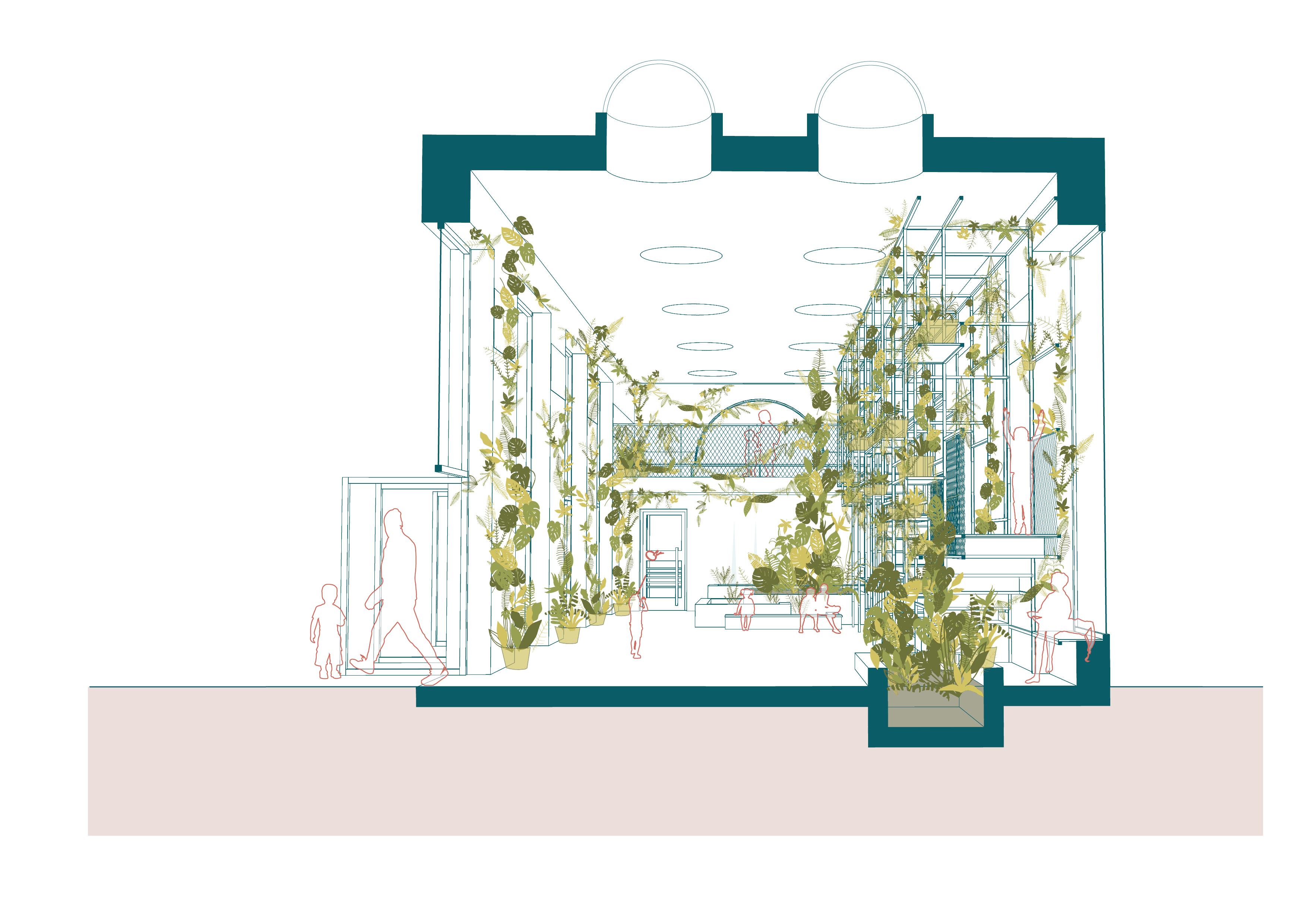 są nasadzenia roślin pnących, okrywowych i soliterów w tym również o właściwościach antysmogowych. Proponowany projekt jest zgodny ze strategią projektowania NBS (rozwiązań opartych na przyrodzie) i myślenia w skali lokalnej o szeroko rozumianym zjawisku Globalnego Ocieplenia Klimatu.