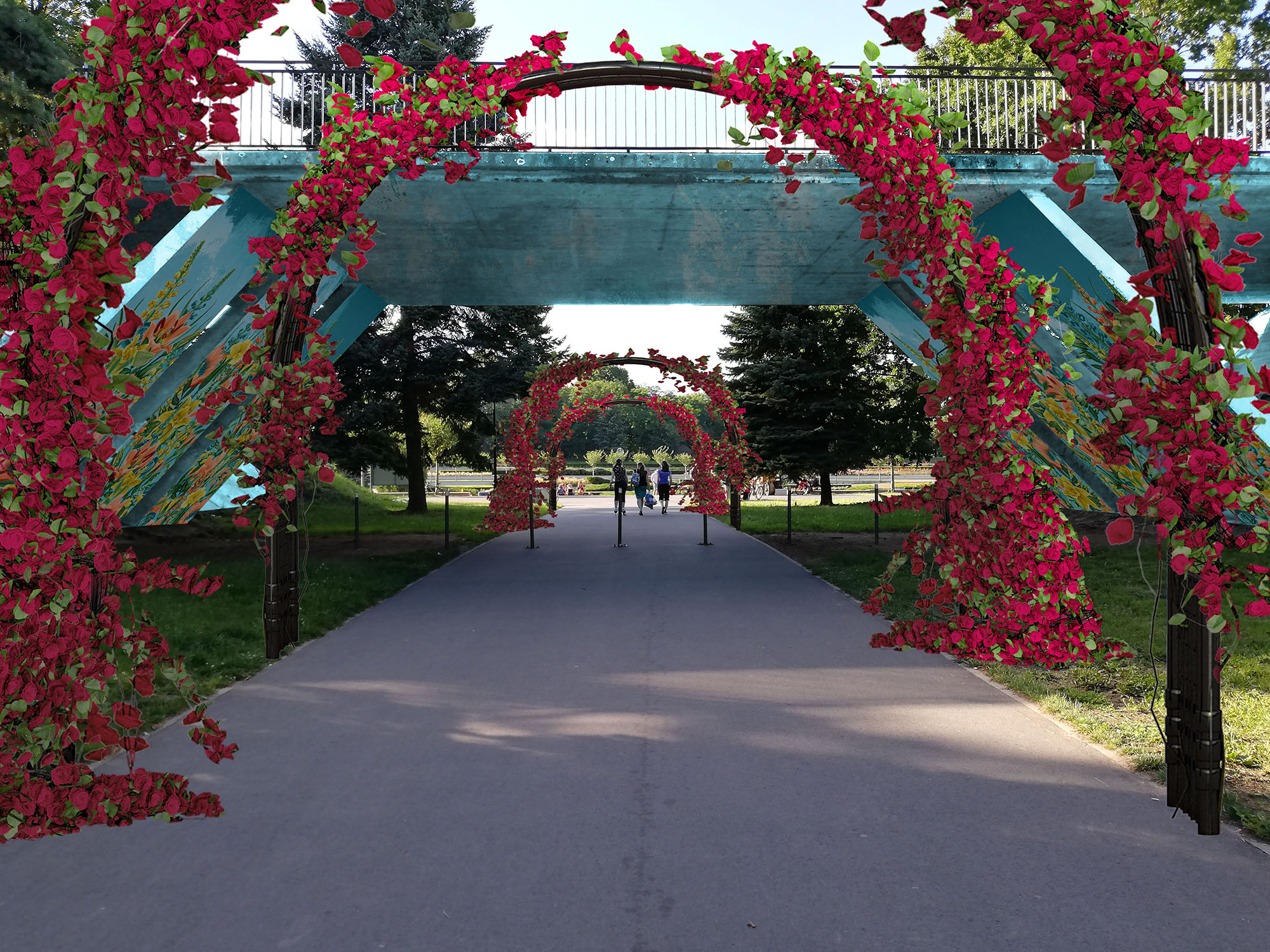 Projekt ma na celu remont wraz z zagospodarowaniem przestrzeni pod mostem w Rosarium w Parku Cytadela. Wpisuje się w renowację istniejącego terenu zielonego zawierając jednocześnie założenia ogrodu deszczowego. Koncepcja polega na wymalowaniu kwiatowego murala na ścianach, stropach i podporach wewnętrznych mostu; wprowadzeniu nasadzeń roślinnych zazieleniających skarpy mostu, budowie dwóch podwójnych pergoli z obu stron mostu wraz z obsadzeniem ich różami, budowie instalacji podświetleniowej pod muralem oraz instalacji odprowadzającej deszczówkę i nawadniającej rośliny wraz z małym zbiornikiem retencyjnym. Ponadto w wybranych częściach Rosarium zamiast trawników pojawią się nowe rabaty różane. Tym projektem dopasowujemy estetycznie mało atrakcyjną przestrzeń podmostową do charakteru otoczenia tworząc tym samym klimatyczne i wyjatkowe miejsce w okolicach Rosarium podnosząc jednocześnie walory estetyczne i atrakcyjność turystyczną Parku Cytadela, które znajdą swoje odzwierciedlenie w mediach społecznościowych sławiąc Park jako zielone płuca Poznania. Ponieważ stan mostu wymaga pilnych prac remontowych ( co potwierdza specjalistyczna ekspertyza techniczna wykonana na zlecenie zarządcy terenu ZZM) wniosek obejmuje, także wymagany remont mostu.